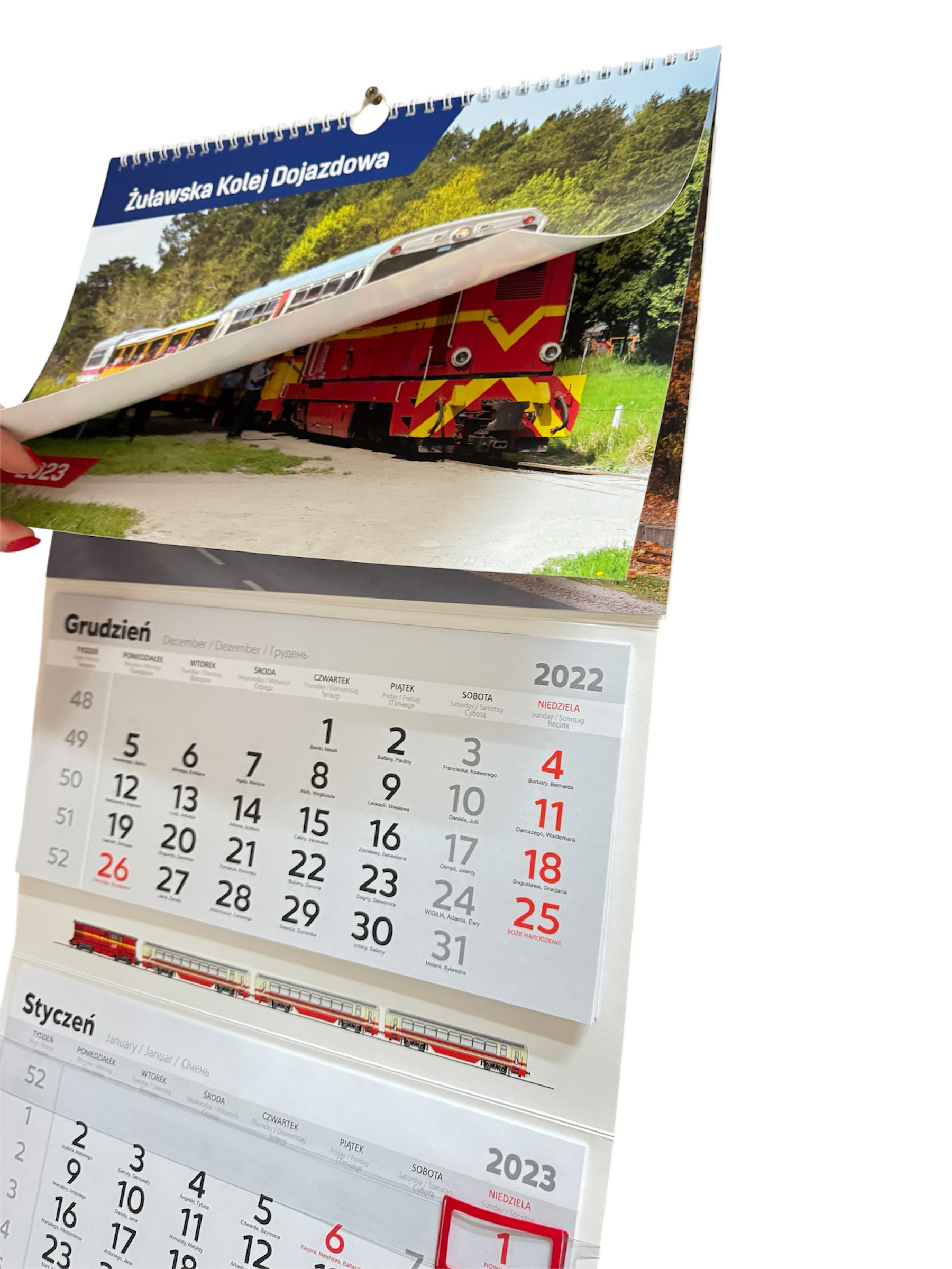 Kalendarium drukowane jest na papierze offsetowym i klejone na gorący klej przy użyciu nowoczesnych maszyn, co zapewnia doskonałą trwałość przez cały rok. Istnieje możliwość wykonania indywidualnego projektu kalendarium – przygotujemy szybką wycenę po otrzymaniu zapytania.